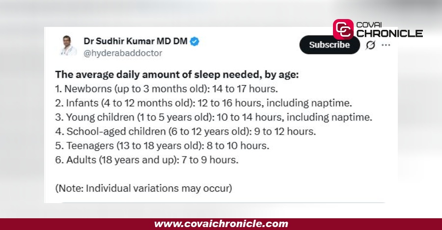 சமீபத்தில் எக்ஸ் தளத்தில் மிகவும் பிரபலமான தனியார் மருத்துவமனையை சேர்ந்த நரம்பியல் துறை மருத்துவர் டாக்டர் சுதிர், மனிதர்கள் எந்த வயதுக்கு எவ்வளவு நேரம் சராசரியாக உறங்கவேண்டும் என்பதை பகிர்ந்துகொண்டார்.இது பல நாட்களாக சமூக வலைத்தளங்களில் வைரலாகவே உள்ளது.